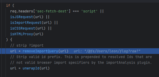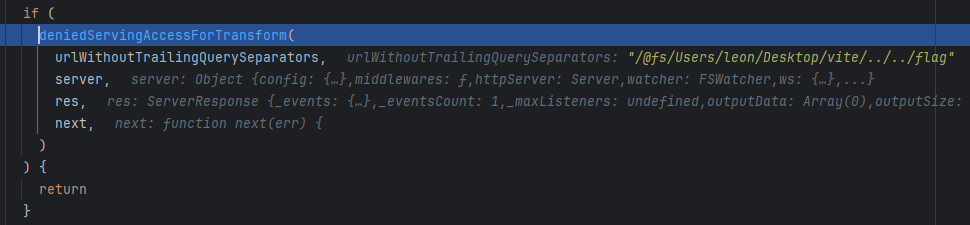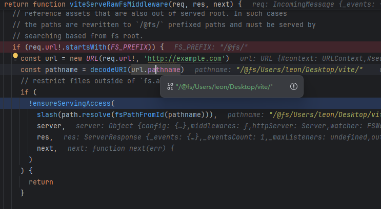 这里检查ensureServingAccess路径是否合法,但是如果此时我们传入#,url.pathname为/@fs/Users/leon/Desktop/vite/,直接绕过了检查