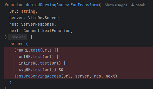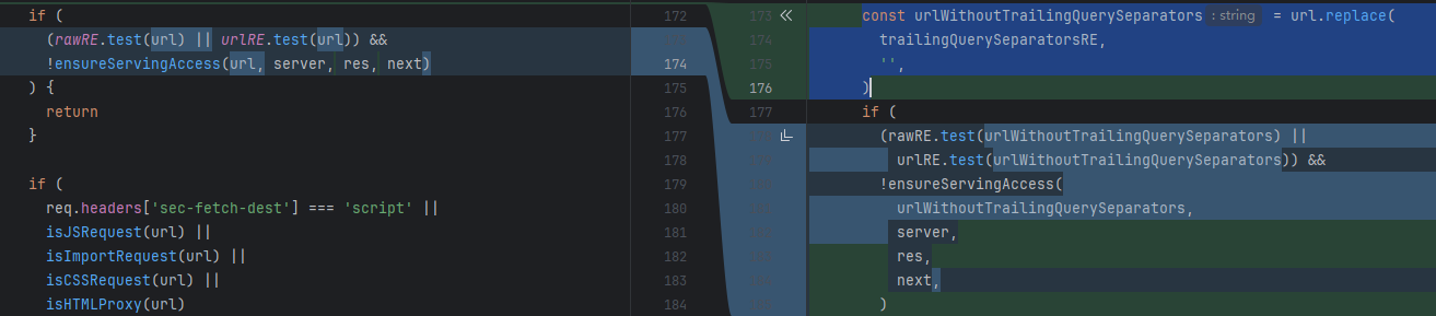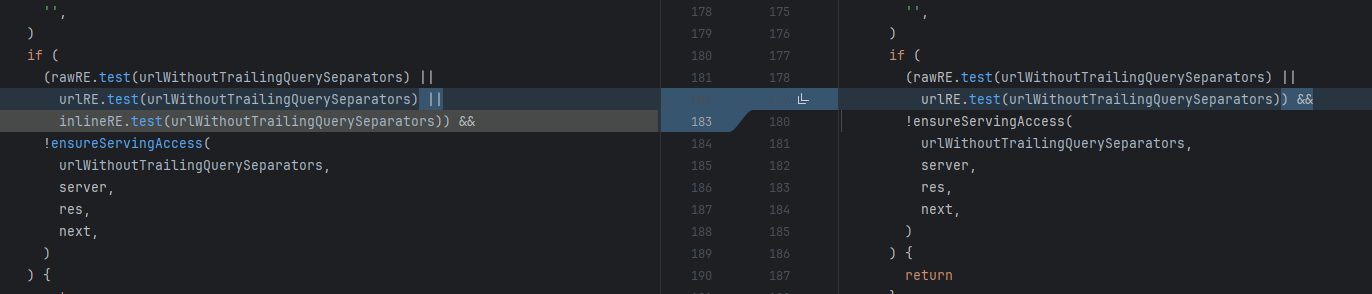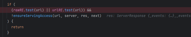 然后因为两个正则都没匹配上,这个正则本意是匹配**?raw**这种恶意参的,但是我们加的**?**只被删了一次,剩下的**?**干扰了正则匹配,导致绕过ensureServingAccess对是否是合法请求源码路径的检查,因为没有?raw的许多正常请求确实不符合ensureServingAccess,所以用&&来短路